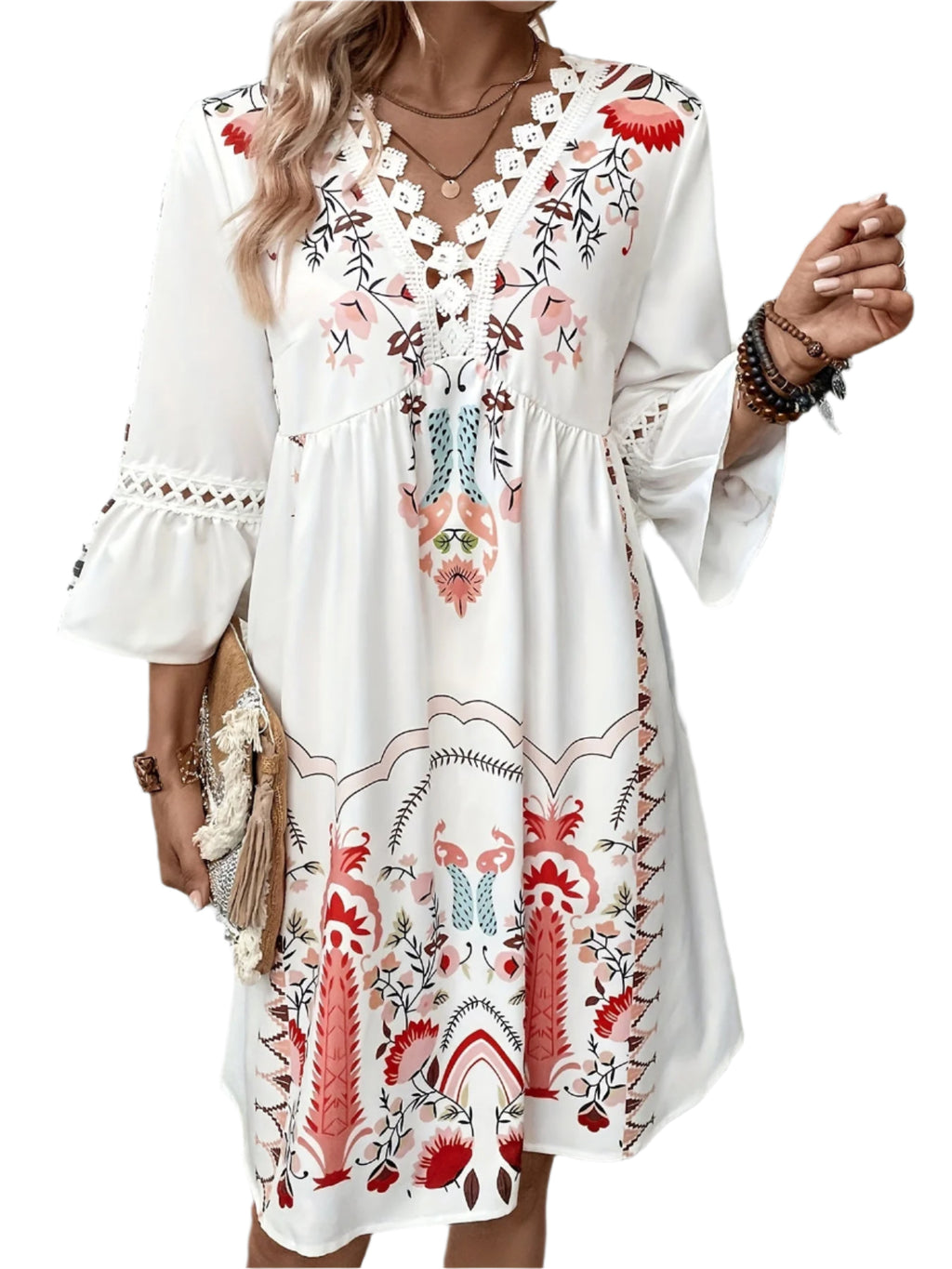 Alma Etnisk Maxikjole med V-Hals er designet til kvinder, der elsker stil med personlighed. Det farverige etniske print kombineret med den flatterende V-udskæring og den løstsiddende pasform skaber en boheme-inspireret stil, der både er komfortabel og iøjnefaldende.