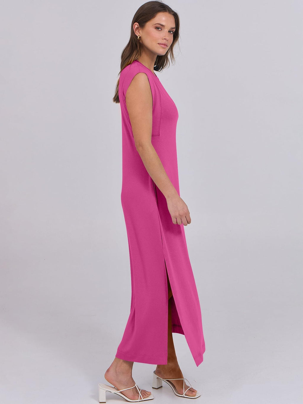 Denne maxi-kjole er fremstillet af en åndbar bomulds-hørblanding og sikrer, at du holder dig kølig og komfortabel hele dagen. Dens minimalistiske design gør det nemt at bruge tilbehør, hvilket gør den til et must-have i enhver sommergarderobe.