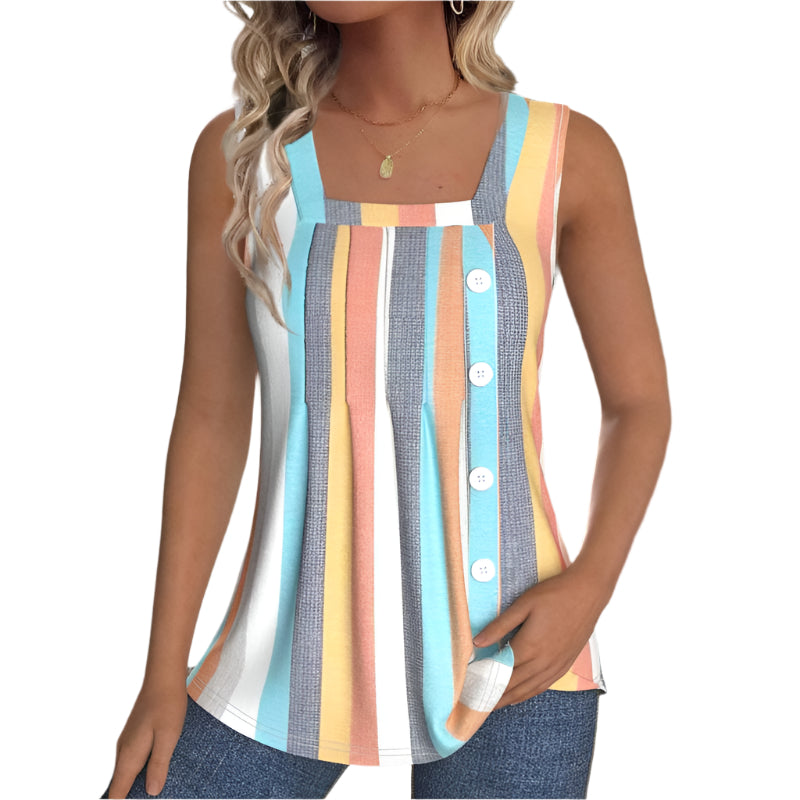 Decerie-blusen er din favorit til ubesværet sommerstil. Med bløde lodrette striber i pastelblå, fersken, gul og grå, har denne ærmeløse top en flatterende firkantet halsudskæring, plisseret overdel og en charmerende knaplukning foran.