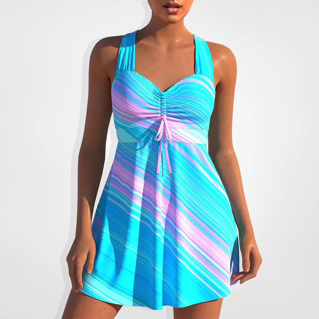 Lavet af højkvalitets, hurtigttørrende stof, denne badedragt tilbyder enestående komfort og støtte. Den indbyggede bh og stilfulde rygstropper giver en tilpasset pasform, mens A-line nederdeldesignet tilføjer et strejf af ynde.