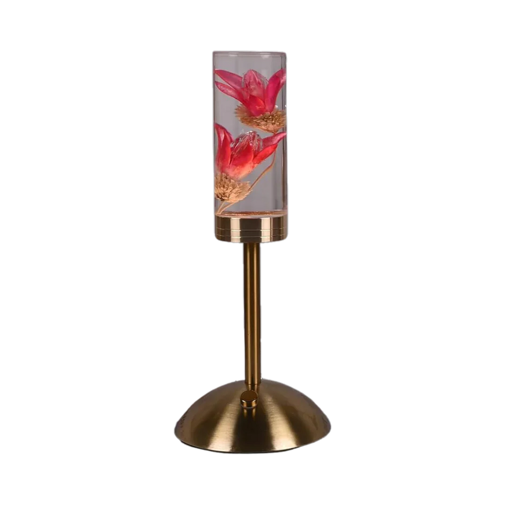 Bring naturens skønhed indendørs med FloraGlow bordlampen. Denne fortryllende lampe har en klar cylindrisk krop fyldt med sarte blomster, blødt oplyst af et integreret LED-lys. Det er den perfekte blanding af botanisk charme og moderne design.