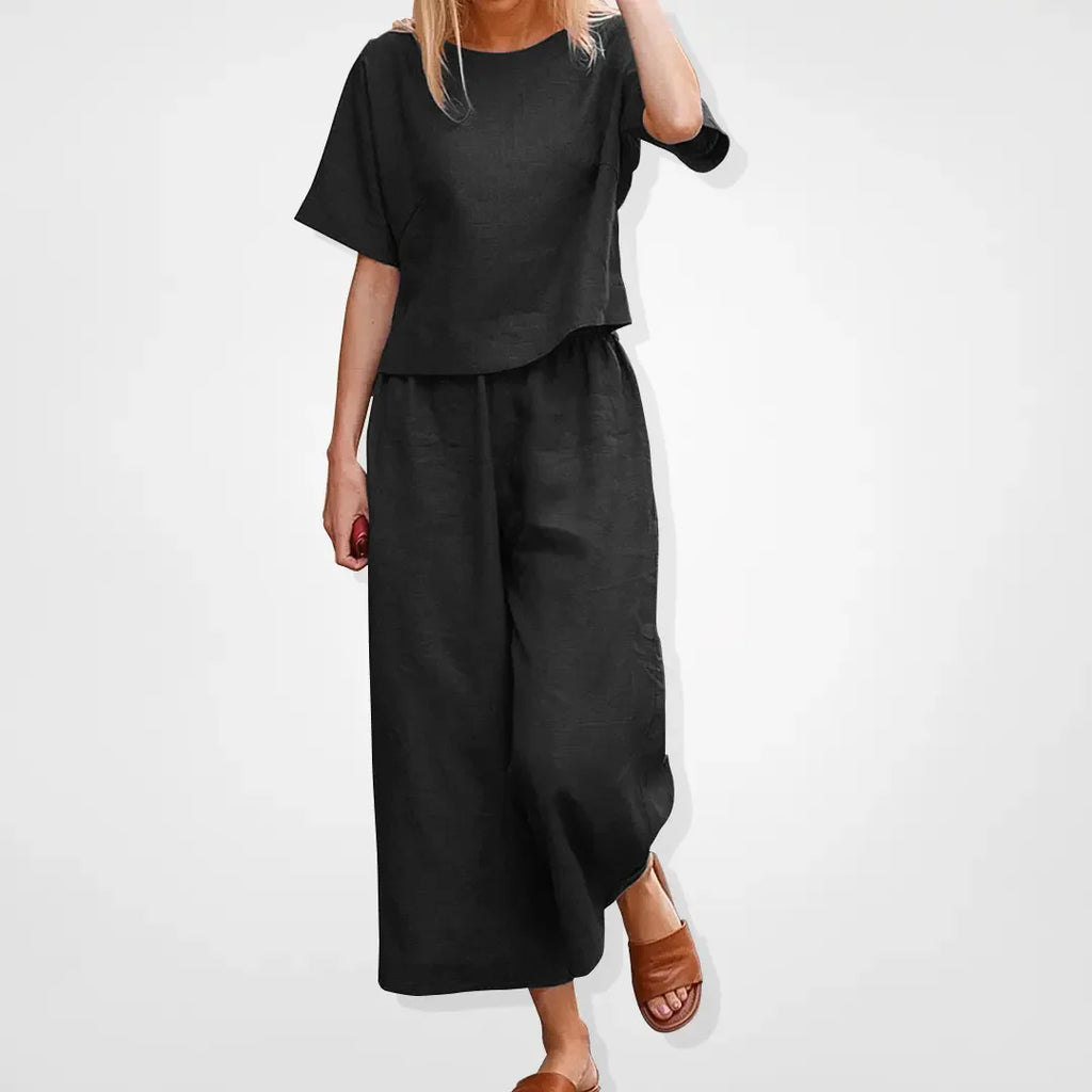 Træd op med det todelte Frida-sæt, den ultimative kombination af afslappet stil og praktisk hverdag. Med en kortærmet bluse og bukser med vide ben får du et afslappet, elegant look, der er ideelt til afslappede udflugter, hyggelige hjemmedage eller afslappede sociale arrangementer.