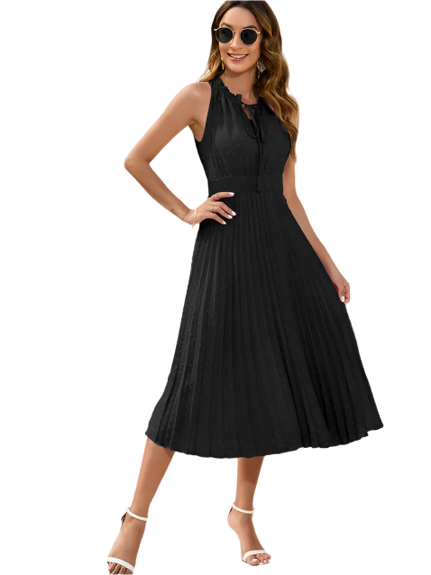 Hale-kjolen er stedet, hvor klassisk charme møder subtil sofistikering. Med sit ærmeløse snit, plisserede nederdel og V-udskæring forstærkes denne midikjole af en blød binde- eller sløjfedetalje ved halsudskæringen - hvilket tilføjer et delikat fokuspunkt.