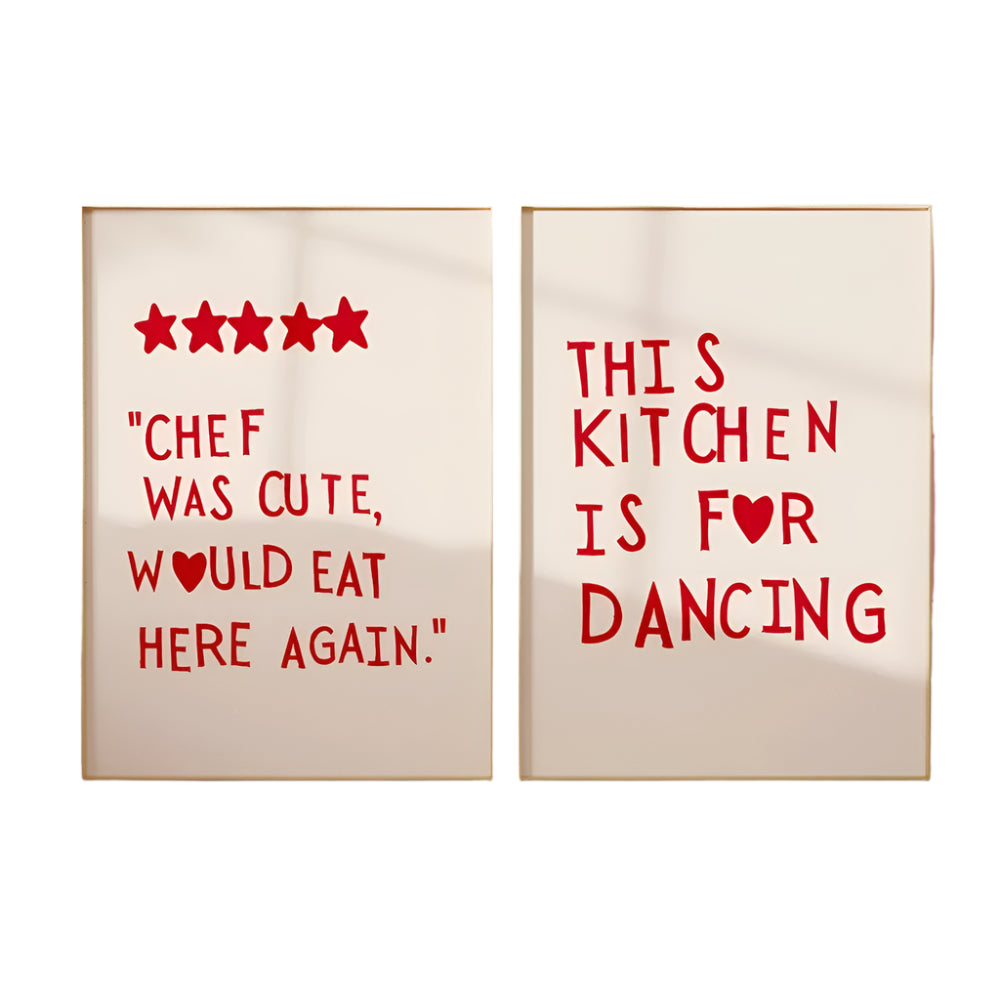 Bring glæde til dit køkken med denne charmerende vægdekoration med plakater. Hver plakat er prydet med sjove illustrationer og geniale tekster, som tilfører en lethed til dit madlavningsrum. Disse plakater forener charme og humor for at skabe et køkken, der afspejler dig. Ramme ikke inkluderet, så du kan matche dit køkken efter din smag.