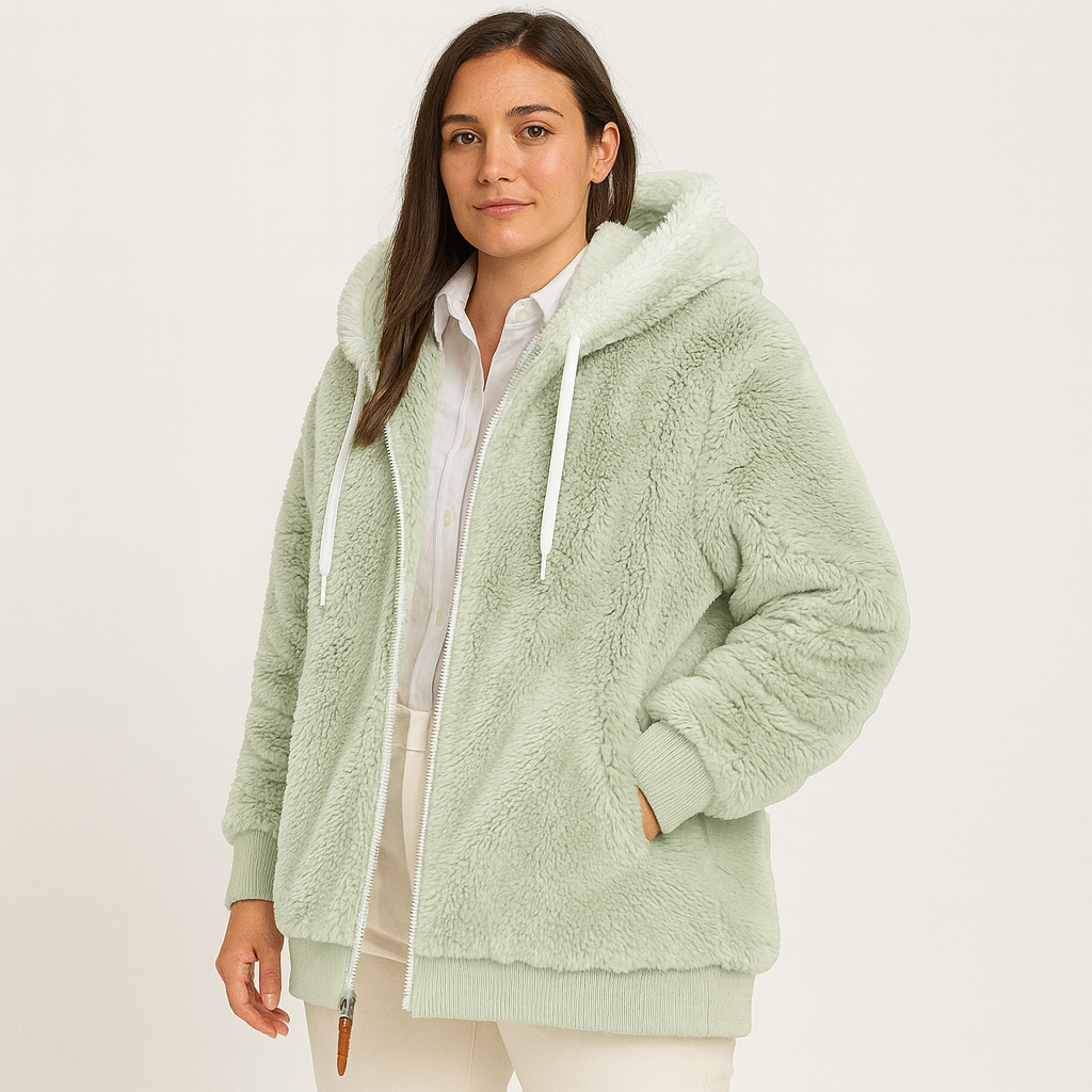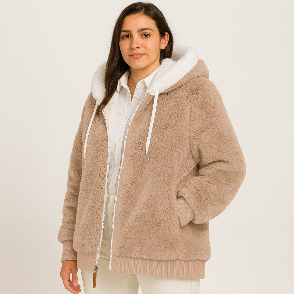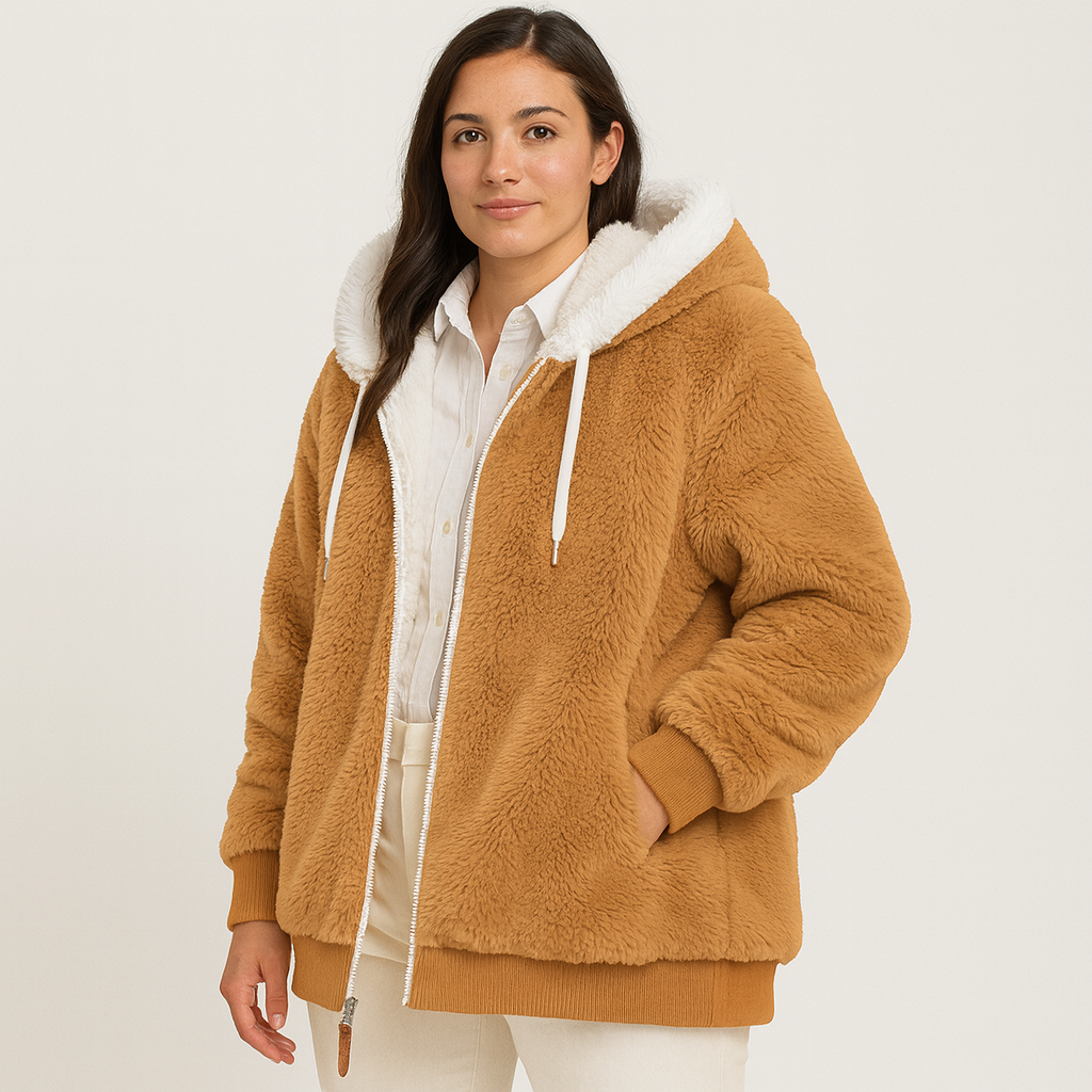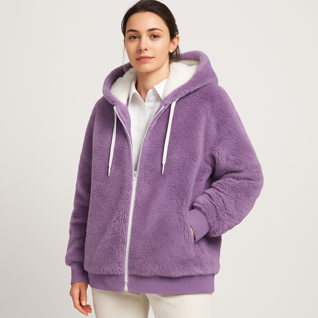 Med enkel lynlås og hætte er denne jakke nem at kombinere med andre outfits. Den bløde plysstruktur og det afslappede design gør den ideel til dagligt brug i den kolde sæson.