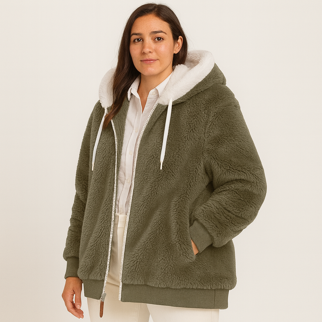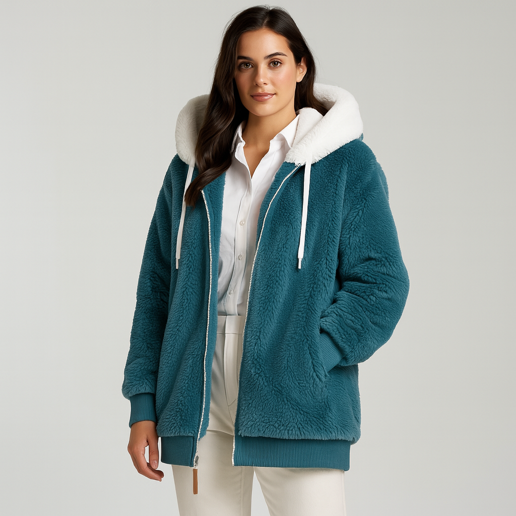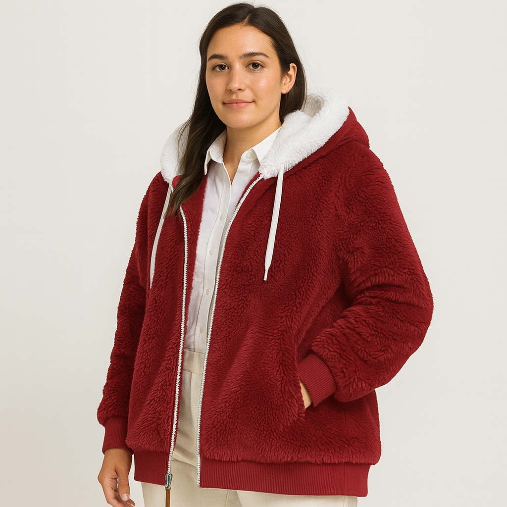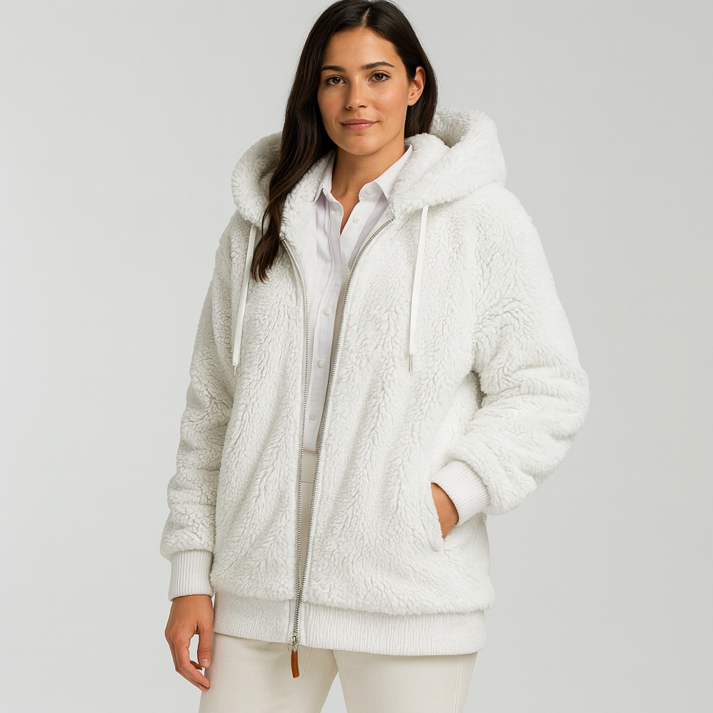 Med enkel lynlås og hætte er denne jakke nem at kombinere med andre outfits. Den bløde plysstruktur og det afslappede design gør den ideel til dagligt brug i den kolde sæson.