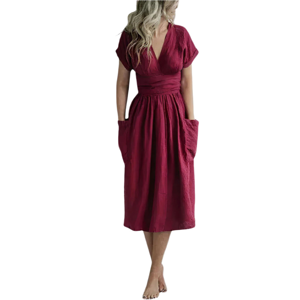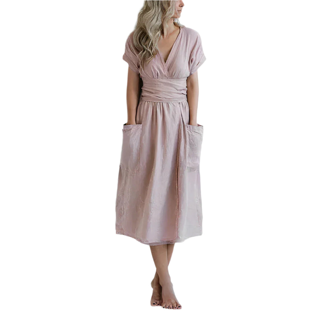 Matilda slå-om kjolen er det perfekte valg til kvinder, der ønsker at kombinere komfort og stil. Den flatterende V-udskæring, korte ærmer og justerbare taljebælte skaber en feminin silhuet, som passer til både hverdag, ferie og afslappede arrangementer. Det luftige design gør den ideel til varme dage, mens det tidløse snit fremhæver din naturlige skønhed.