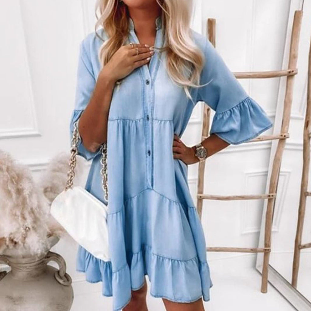 Træd ind i tilbagelænet elegance med Medusa denimkjolen, hvor komfort møder chic. Med sin afslappede pasform og lagdelte struktur smigrer den hver figur, mens den holder dig ubesværet stilfuld. Klokkeærmer tilføjer en blød boho-charme, der løfter dit hverdagslook.