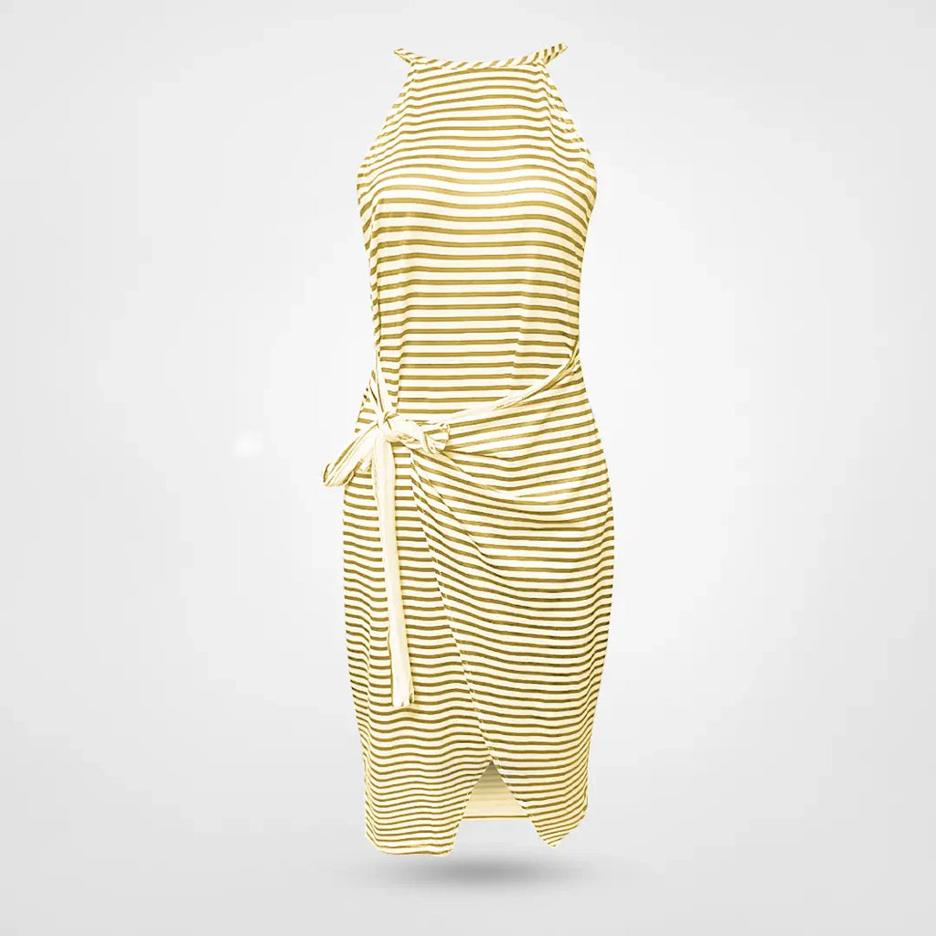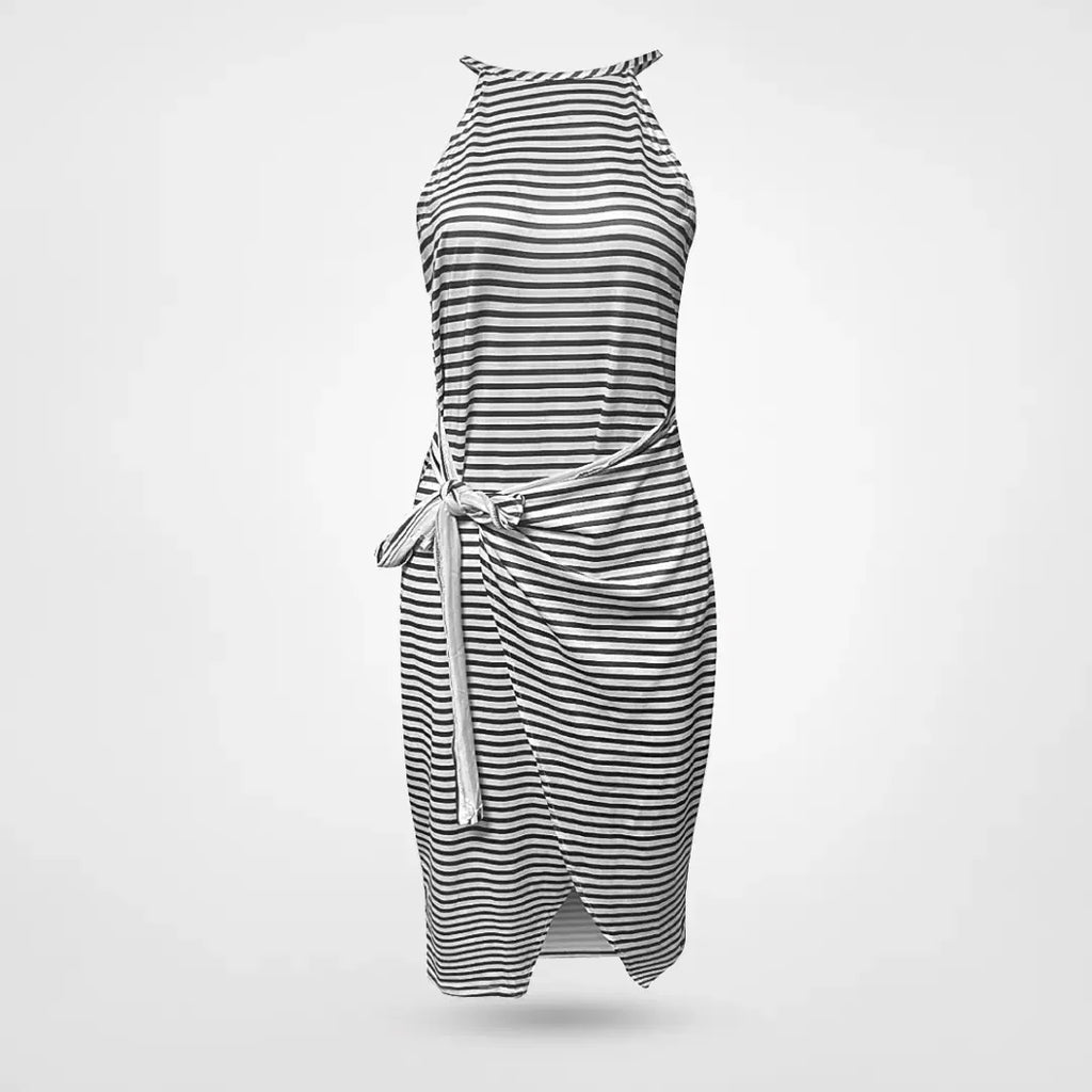 Forkæl dig selv med den stribede, ærmeløse midikjole Mia, der udtrykker tidløs raffinement med et moderne twist og en flatterende silhuet, der gør den til den perfekte basisgarderobe til afslappede udflugter, sommerbegivenheder eller strandture.