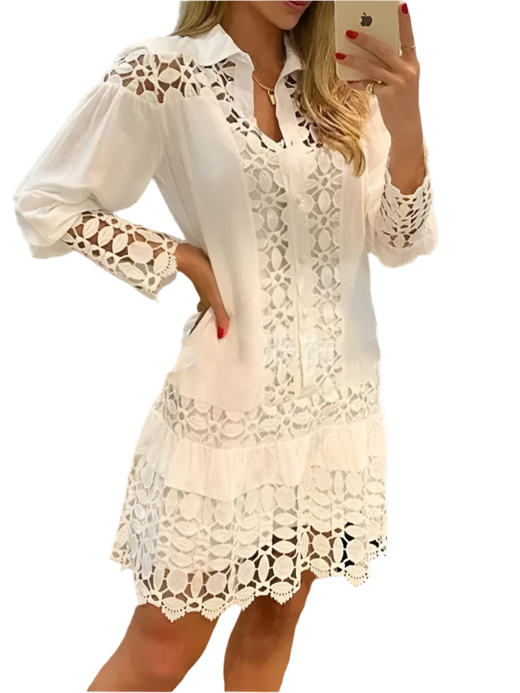 Murphy-kjolen er en perfekt blanding af elegance og femininitet. Med en halsudskæring og lange ærmer er den poleret nok til kontoret og yndefuld nok til særlige lejligheder. Forsiden har smukke blomster- og bladinspirerede blondeudskæringer, der løfter din hverdagsstil.
