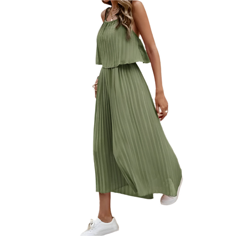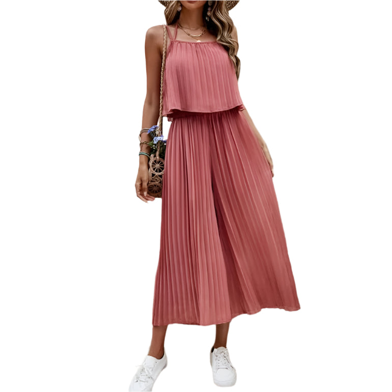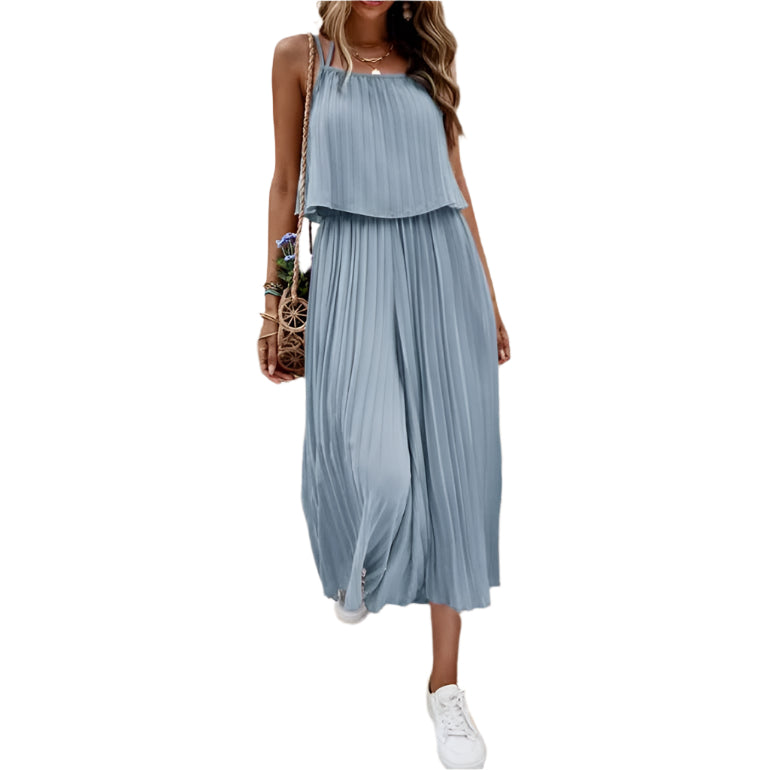 Gå ind i sommersæsonen med dette elegante og luftige outfit i to dele, der består af en delikat spaghettistropper-top og en flagrende plisseret maxinederdel. Designet til at tilbyde både elegance og komfort, er dette sæt perfekt til ferier, afslappede udflugter eller dagtimerne. Dens minimalistiske silhuet og lette fornemmelse gør det til et godt valg til at holde sig kølig og stilfuld i solen.