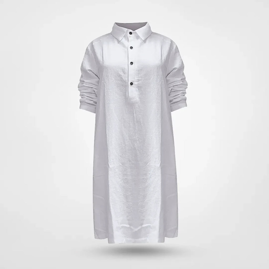 Løft din stil med Sophia-kjolen med knapper, der kombinerer sofistikering og komfort i ét fantastisk stykke. Designet med en klassisk knaplukning foran og yndefulde lange ærmer, udstråler den ubesværet charme. Den skræddersyede pasform smigrer enhver silhuet, hvilket gør den til en alsidig basis til enhver lejlighed.