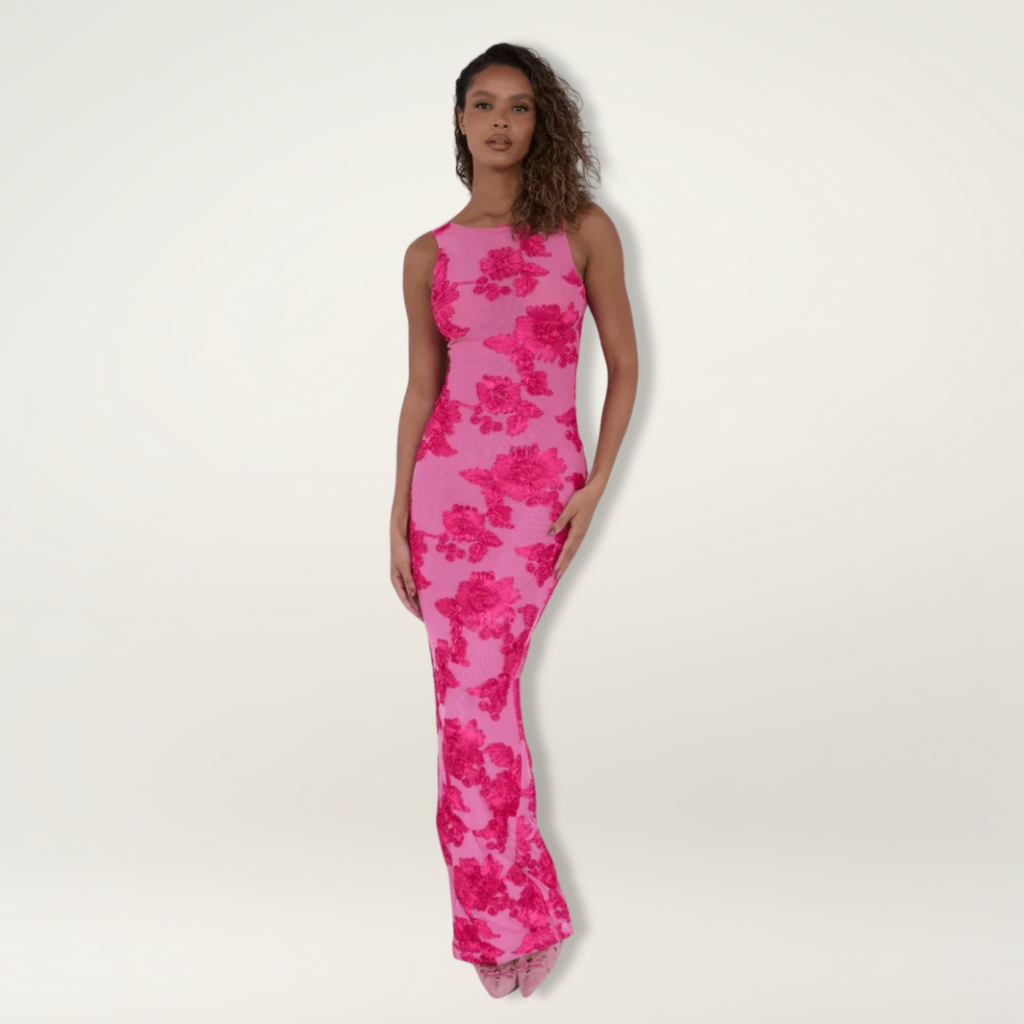 Stella-kjolen gør et statement med sin livlige pink nuance og fængslende blomsterprint. Dens figursyede silhuet omfavner dine kurver på alle de rigtige steder, mens det ærmeløse snit og den høje halsudskæring tilføjer en raffineret, elegant balance. Denne kjole er skabt til øjeblikke, der kræver opmærksomhed.